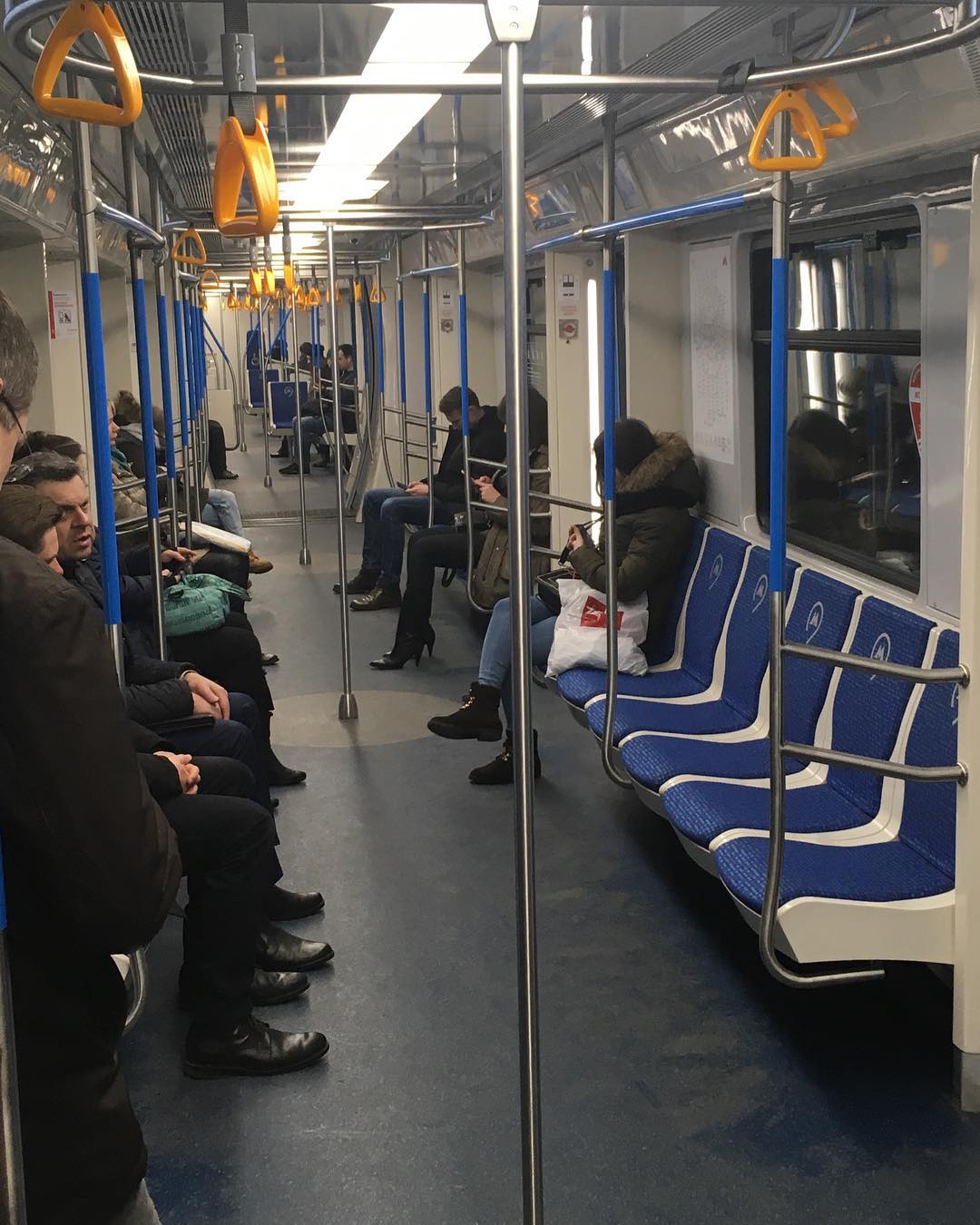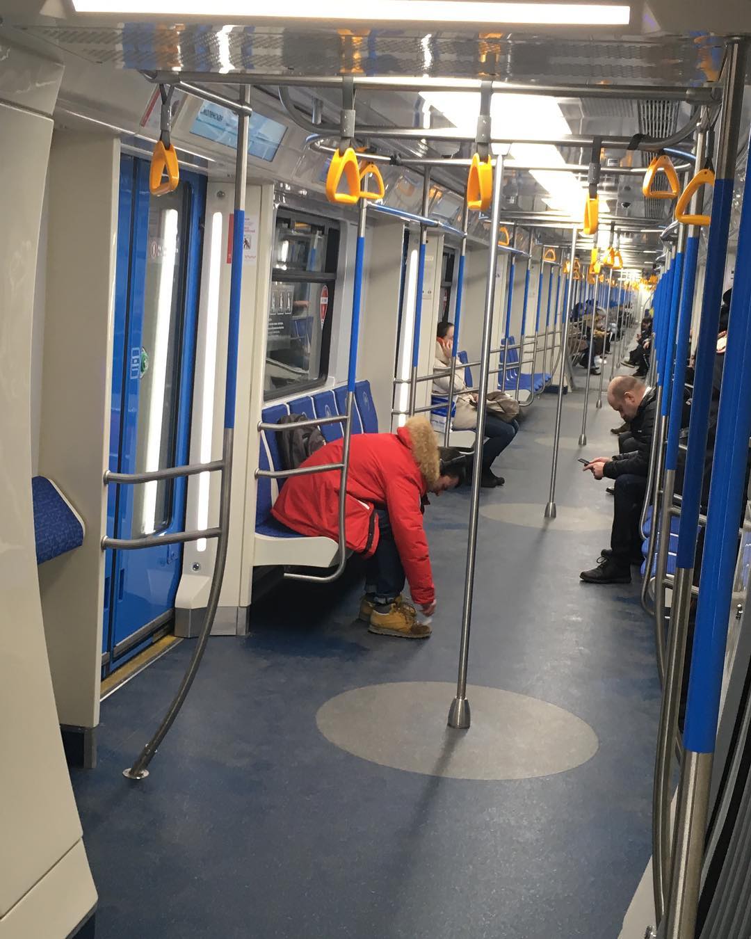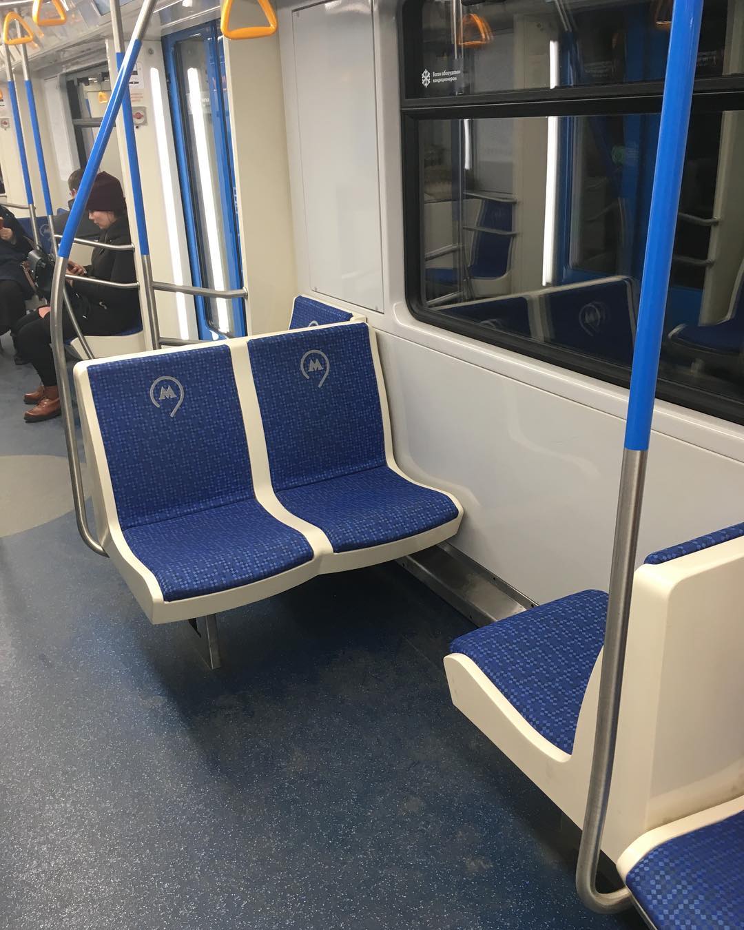 Чудесная Москва на филёвской линии: с потолочными ф-поручнями и одинарными стриптиз-пилонами, с креслами поперёк салона и ещё со складными сидушками. А ещё двери открываются по кнопке. Ну и моднейшие табло с анимацией присутствуют. Кайф!