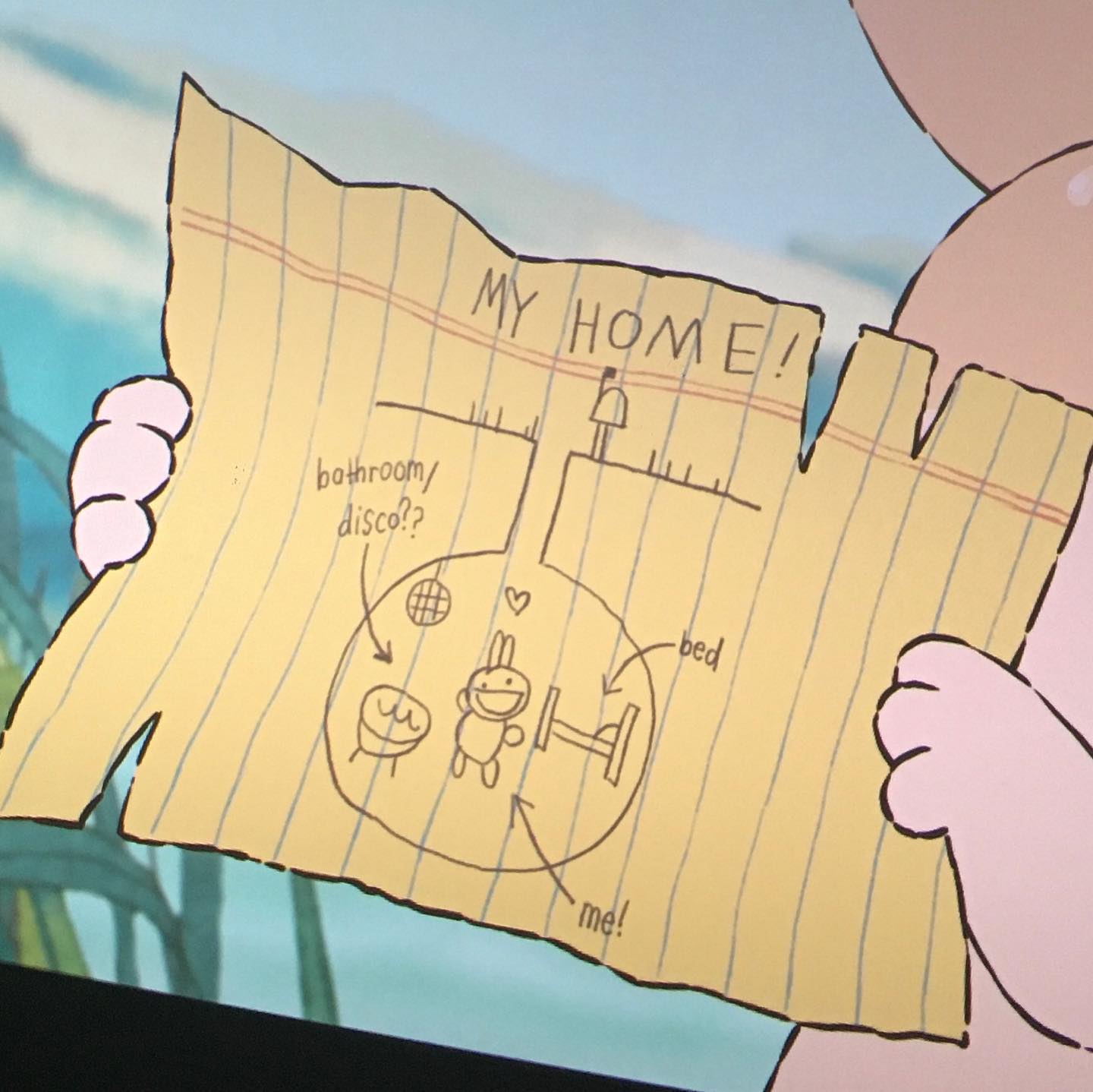 Перед основной картиной показали традиционный мини-мульт: некий зайцеподобный зверь попадает в передрягу, роя себе нору в земле. В кадре несколько раз мелькает проектная документация, где на плане жилища есть bathroom/disco, такая вот рифма с главным инфоповодом последних дней