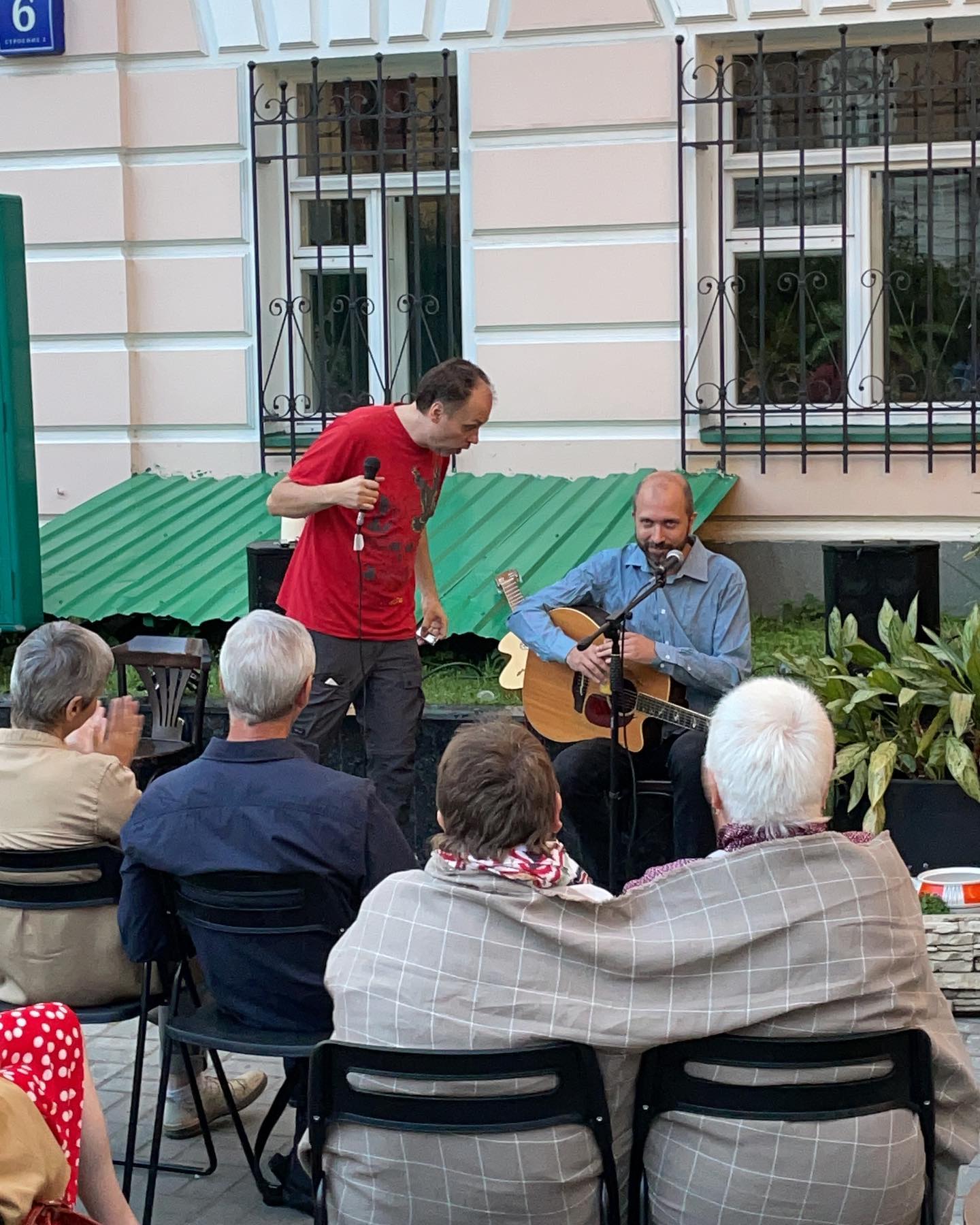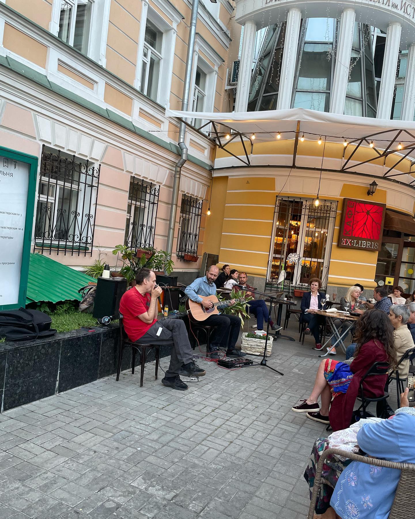 Ну и четверг. Бессменный экипаж Станции Мир, фантастические мастера блюза, национальной песни и гитарно-гармошечной иронии Вовка Кожекин @vovkakozhekin и Иван Жук на веранде Арт-кафе Ex:Libris. В программе вечера — цыганский лайвлупинг, гармошечные соло через мегафон, любимые стандарты, шляпа по кругу в виде супницы, экскурсия по музею советского фарфора 60-х от создателя, знаменитый Чизкейк От Кожекина.