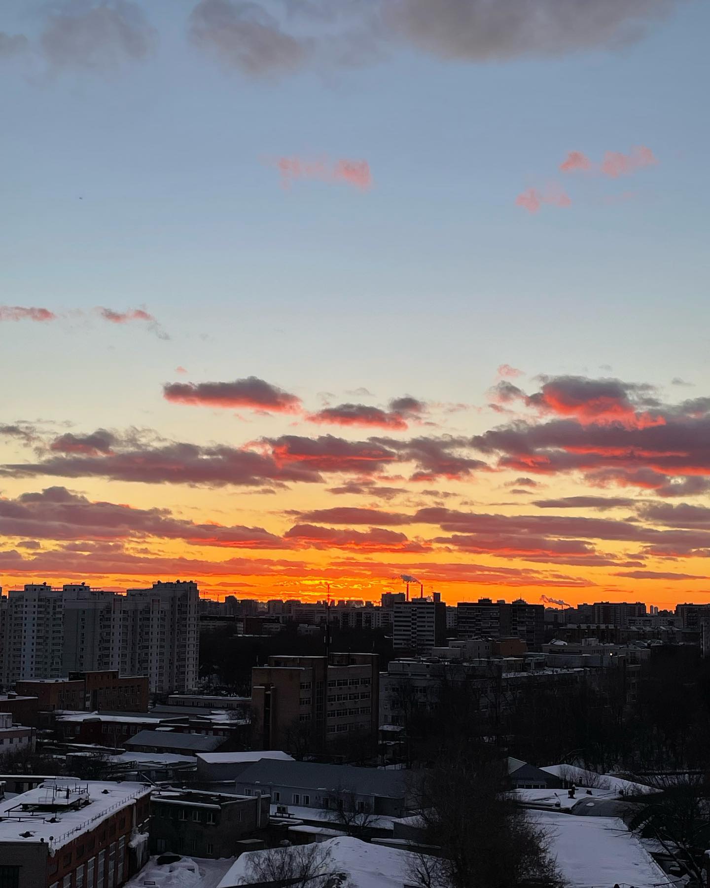 В полдень солнце шпарит из высей над соседним микрорайоном, крыши которого оно с трудом одолевало последние пару месяцев. А вечерами — заливает небо красками и квартиру розово-оранжево-алыми светотенями.