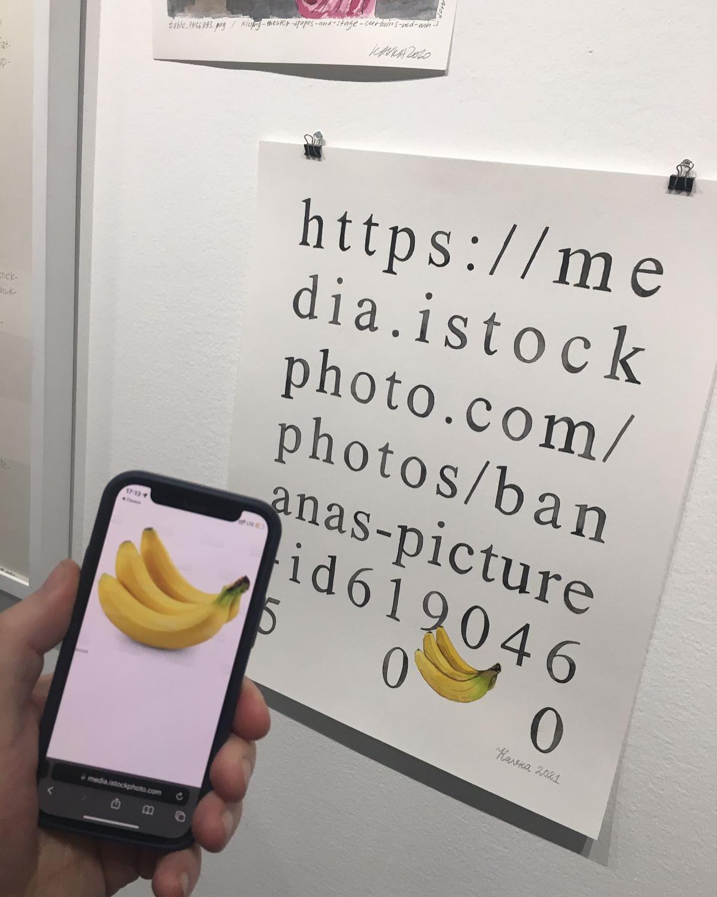 Хайлайты. Экспонат про Кучинскую свалку с видео-экскурсией и рассказом про эпоху Мусорного Монстра. Две нейросети — одна рисует картину по описанию, вторая описывает увиденное на картине и рассказывает об этом первой ♾. Компьютерная игра — симулятор безысходности ШХД: ЗИМА/IT’S WINTER. Картины с изображениями с фотостоков (адреса реальные, я проверил — см картинку с бананом). Лазерные жужжалы и робот, следующий за тобой. Трехмерный фильм про гуманоидов, которые выстраиваются в грязевом постапокалиптическом поле за бараками в фигуру, которую ты задаёшь (но у ИИ есть воля, и фигуру он может по своей прихоти изменить). Фейковые исследования о тайной жизни растений, оформленные как стенды с выставки. Робот для чтения Библии в соответствии с частотой использованных слов. Выпуск новостей, смонтированный из трансляций геймеров.