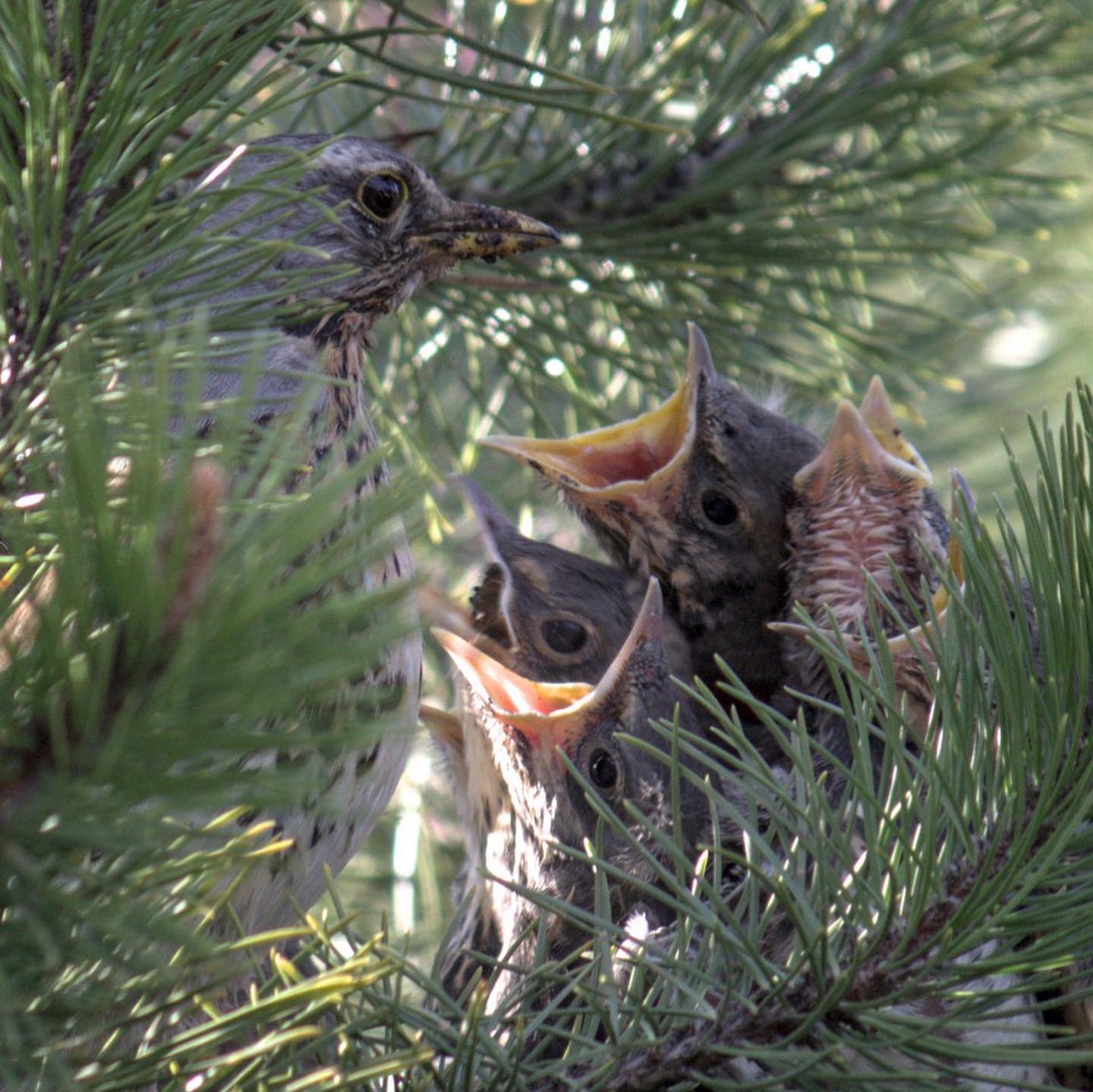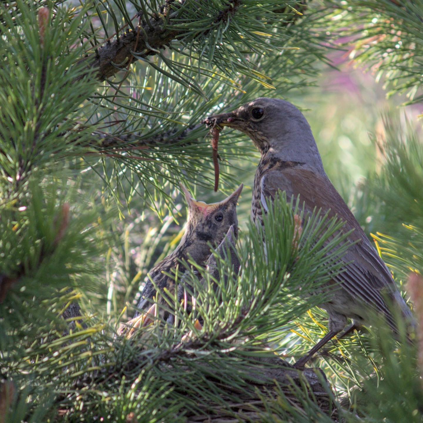 Дрозды ведут себя по-хозяйски: гоняют других птиц, таскают без отдыха червяков, орут на людей при приближении к сосне.