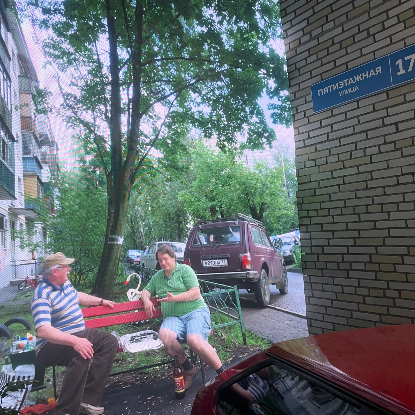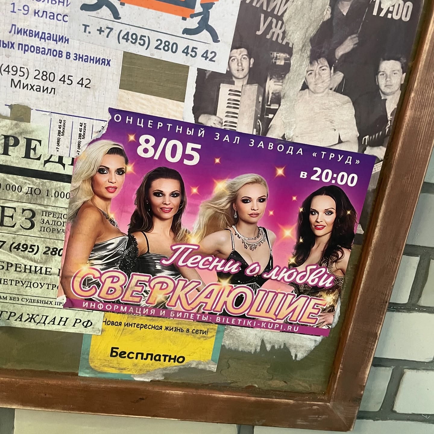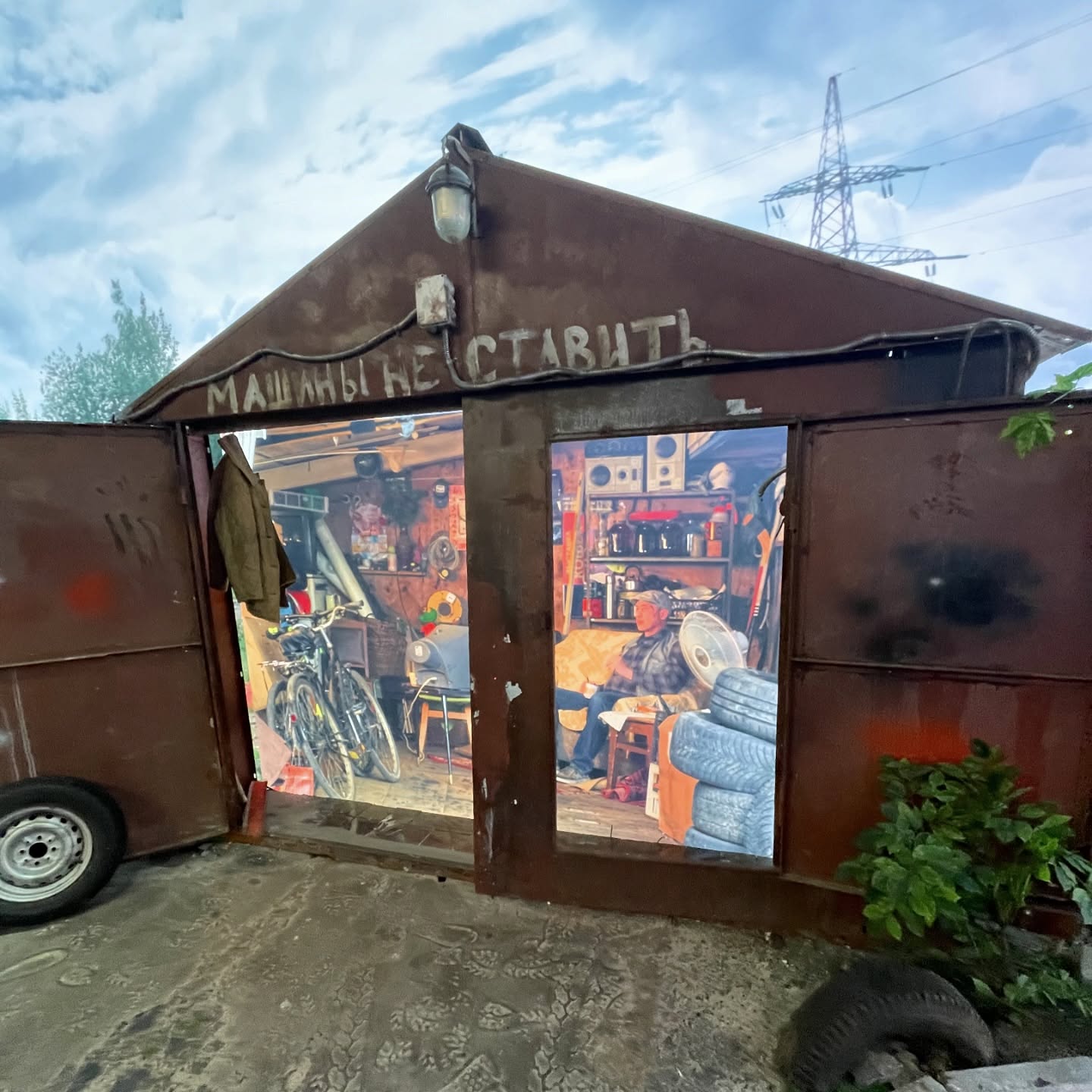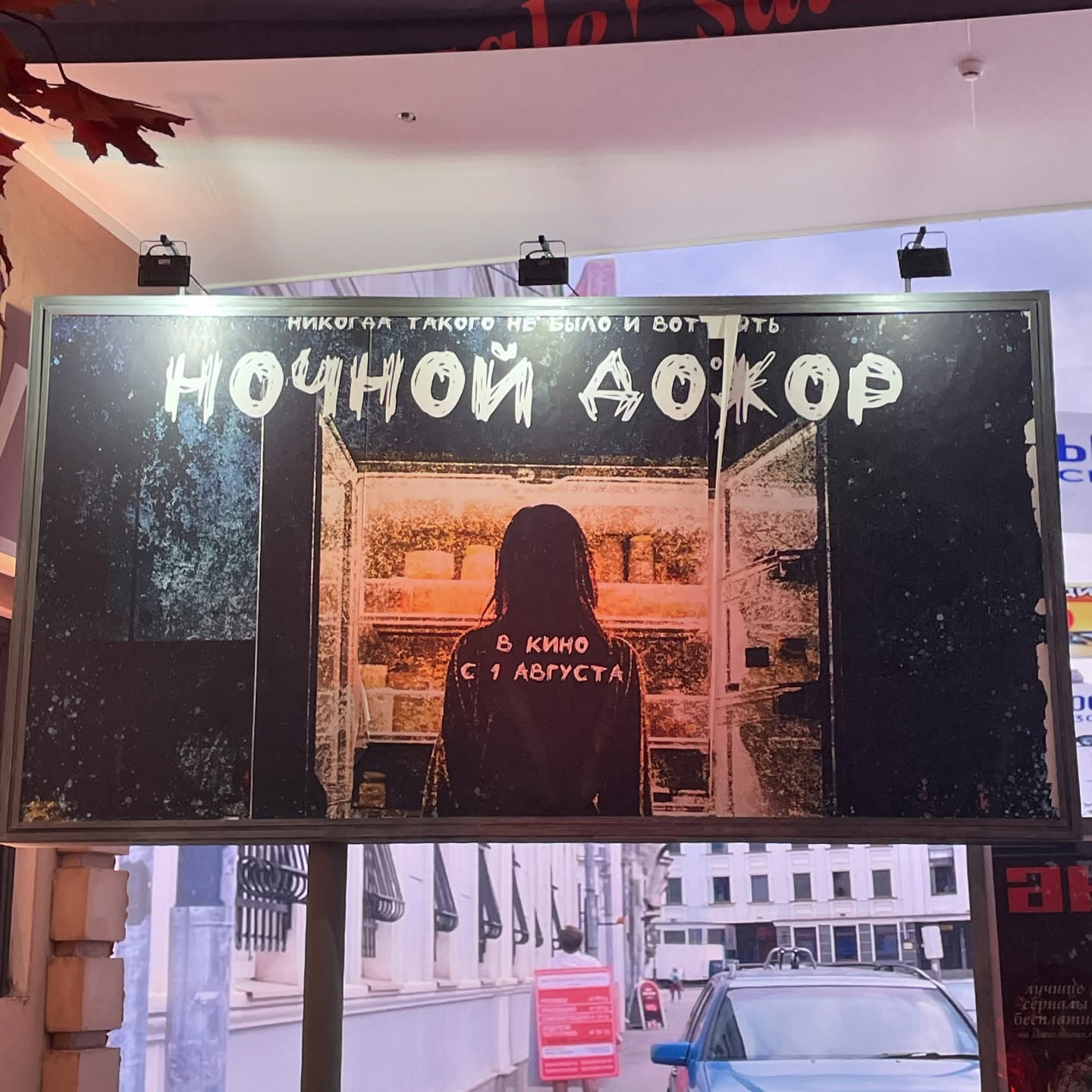 Видеостены вставлены в физический декор так, что не везде понимаешь переход. Кот на балокне смотрит наверх не просто так — над ним сушится рыба. В дыре в заборе виден пустырь — но иногда там пробегает пацан с мячом. Тачки в засранном дворе «как было» — все сплошь старых моделей и на двухзначных московских регионах. Обьявления на стенах и остановках рекламируют концерты груп ВИ8 и Сверкающие, с однозначно считываемой отсылкой. А номер телефона везде указан один (и я даже по нему позвонил). Парочка в проезжающем мимо автобусе флиртует у двери. Реклама кино «Ночной Дожор» с характерным шрифтом и женшиной на фоне холодильника — я даже не понял сначала что это оммаж. Названия улиц (Хаотичный проезд) и так далее. В итоге по экспозиции я прошел дважды и постоянно находил гэги и закладочки от авторов.