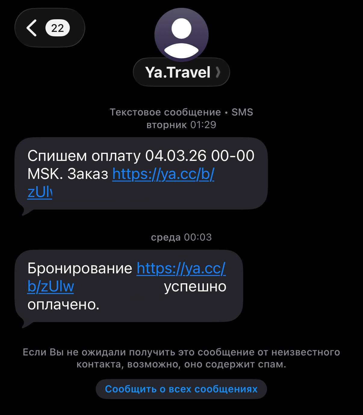 Первую СМС о том, что скоро срок бесплатной отмены закончится и баблосищи у меня спишутся, заботливые роботы яндекса прислали мне через неделю после бронирования, в полвторого ночи. Вторую — о том что срок закончился, и деньги списались — ещё через сутки в 00:03.