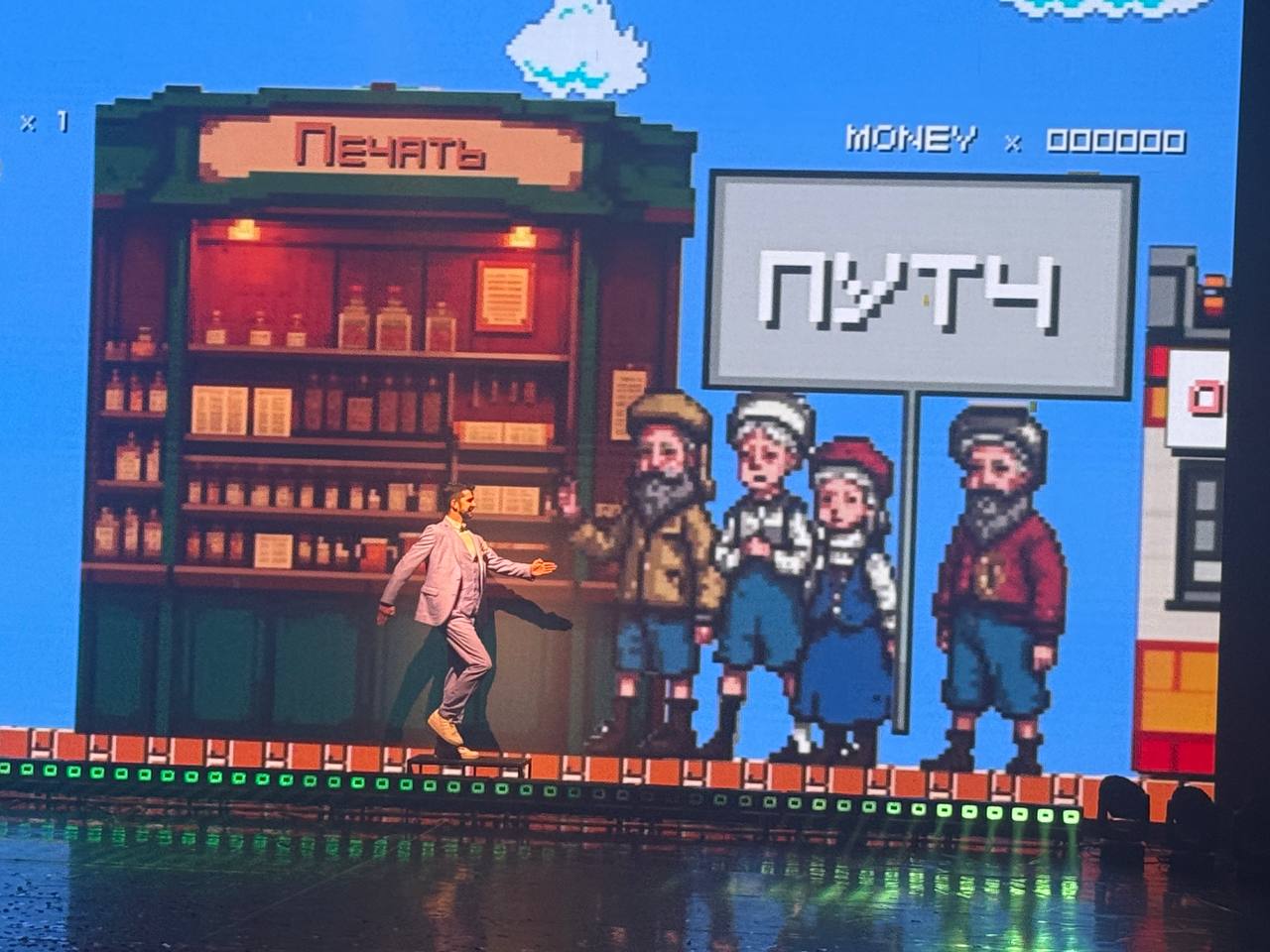 Так вот, сам спектакль мне понравился неимоверно. Классический подход «расскажем серьёзное, обмазав смешнявками», дополненный офигенной сценографией и постановочными приёмами. Начало второго отделения, решенное в видео-лайвлупинг технике сразило наповал, но и других моментов (особенно игр с камерой, транслирующей происходящее на сцене в другом ракурсе) было очень много. Шикарно работает расширение пространства минималистичных декораций через свет и видеоэффекты. Полноэкранный Марио про жизнь — ультравосторг! Актёрская игра, танцы, гэги и синхронные приколюхи, песни и живые инструменты, постоянные повороты сюжета и слом четвёртой стены, да то же филигранно-снайперское выкатывание покрышек под финал — представляю, сколько труда вложено в такой результат.