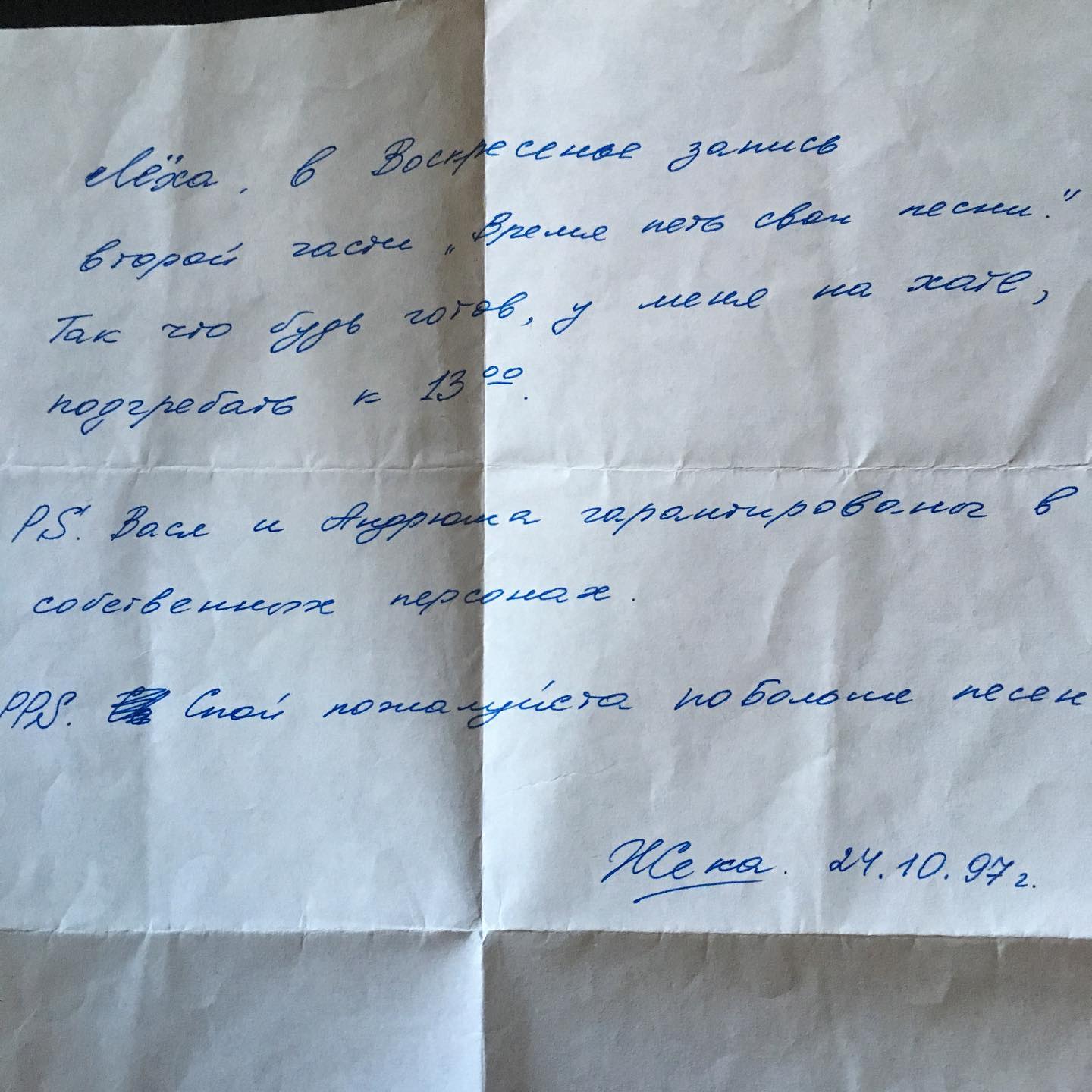 На фото — записка, с помощью которой (не помню уже почему не лично) Жека зовёт меня на запись второго сборника, анонсируя участие в гиге моих друзей-конкурентов в гитарном походе за славой и девичьими сердцами @impekru и @andrey_korolchuk.