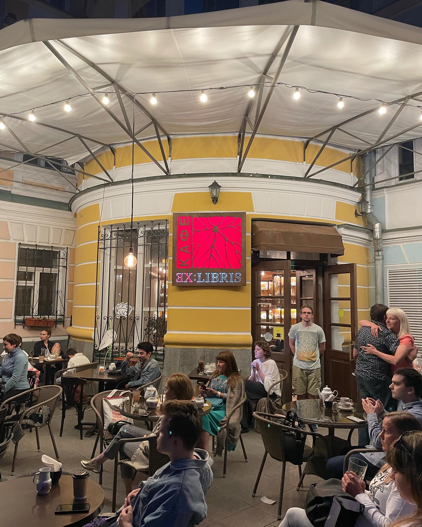 Ну и четверг. Бессменный экипаж Станции Мир, фантастические мастера блюза, национальной песни и гитарно-гармошечной иронии Вовка Кожекин @vovkakozhekin и Иван Жук на веранде Арт-кафе Ex:Libris. В программе вечера — цыганский лайвлупинг, гармошечные соло через мегафон, любимые стандарты, шляпа по кругу в виде супницы, экскурсия по музею советского фарфора 60-х от создателя, знаменитый Чизкейк От Кожекина.