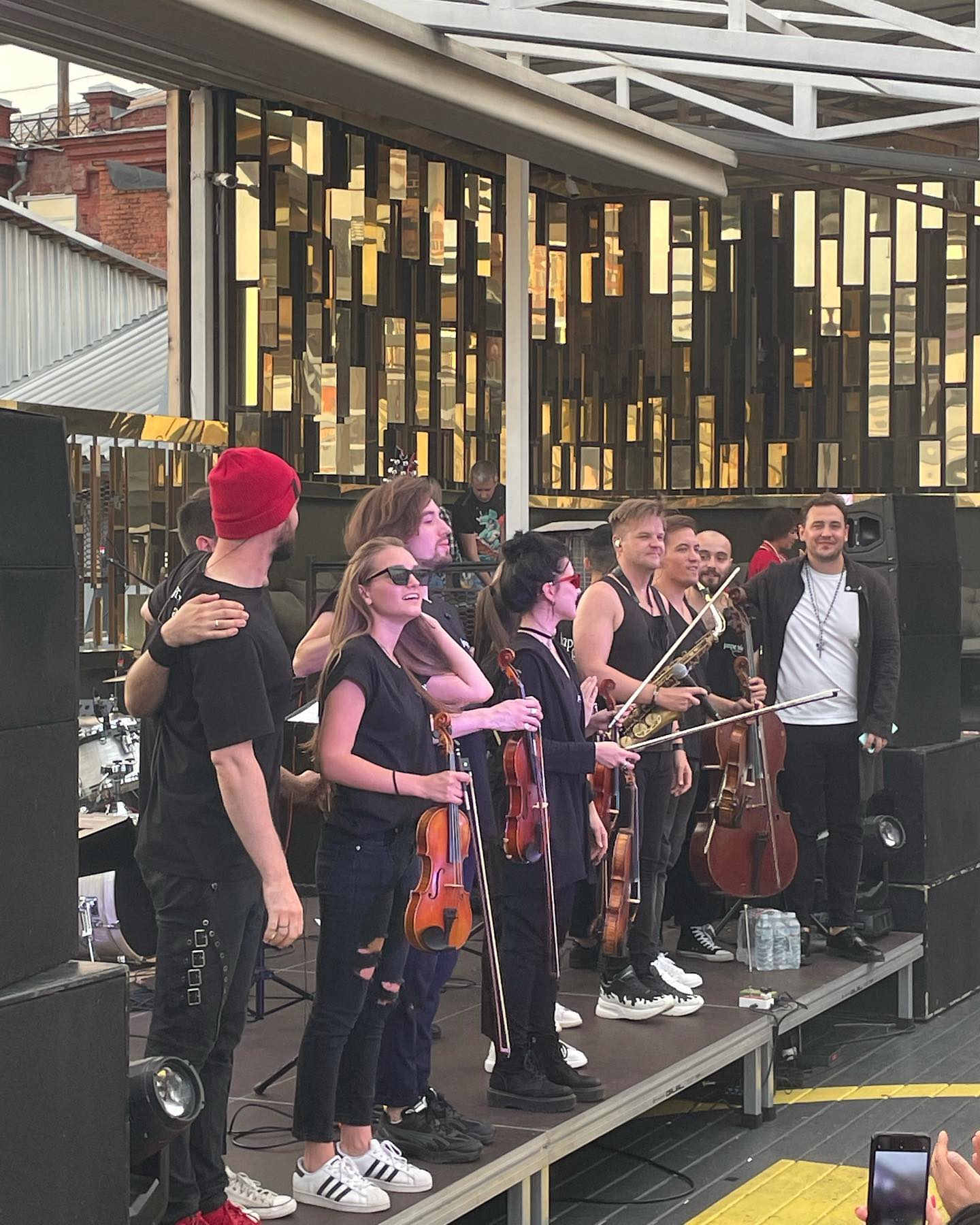 Благодаря сюрпризному приглашению от Натали, оказался на шоу @imperialisorchestra на крыше @fantomas_rooftop: молодые профи шарашат хиты в симфоническом прочтении — с большой струнной группой, саксофоном, и рокешными басом-гитарой-барабанами-синтами. В некоторых композициях солировал вокалист, в остальных — сакс, скрипка или альт.