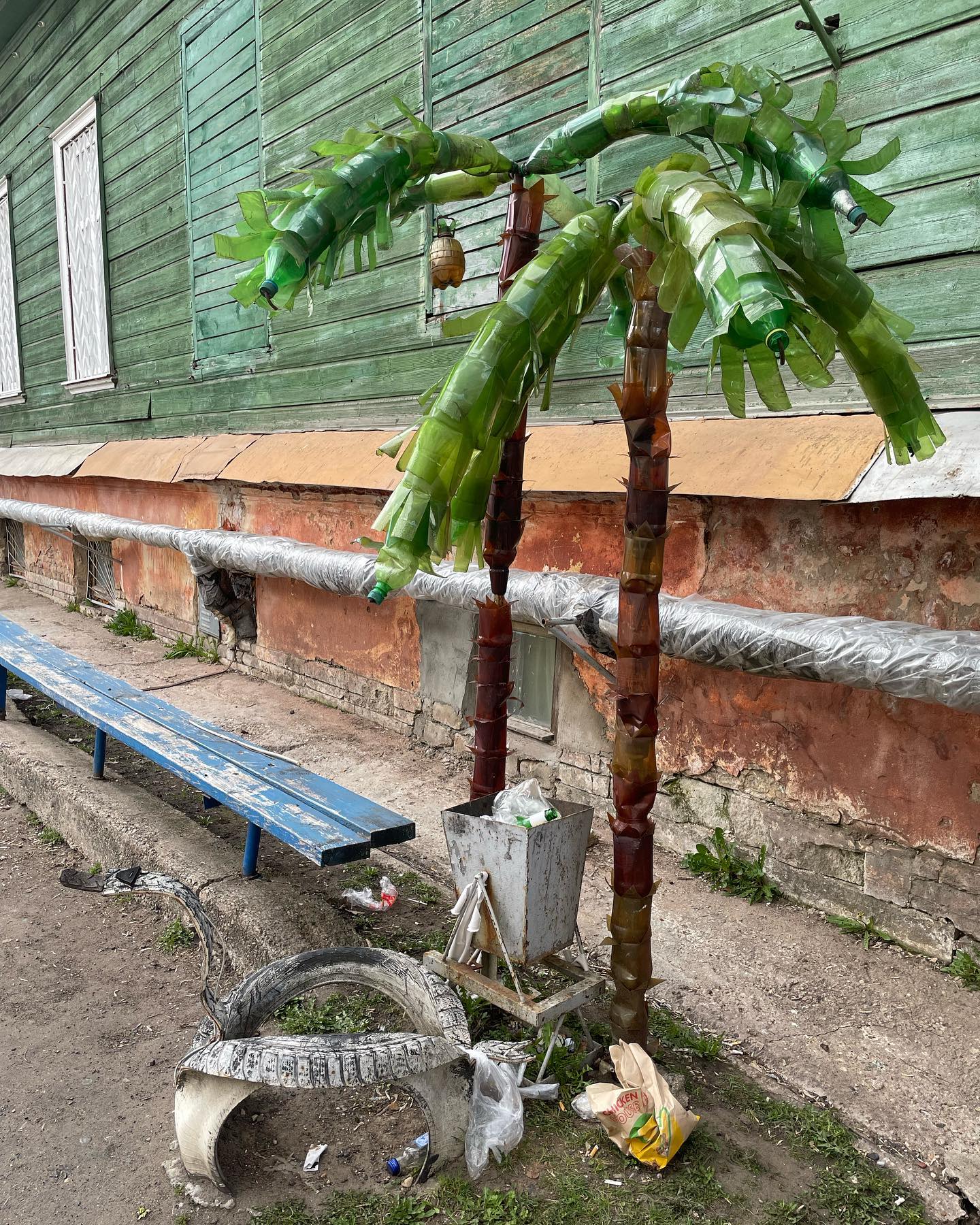 Пробежался по переулкам, лесенкам и мостам. Нашёл пальму из пластиковых бутылок. Повалялся на лавочке. Прочёл в Википедии про Борисоглебский монастырь с колокольней, куда можно подняться, решил напоследок заехать туда. Натали устала от культурного обогащения и ждала в машине, а я прошёлся по территории.