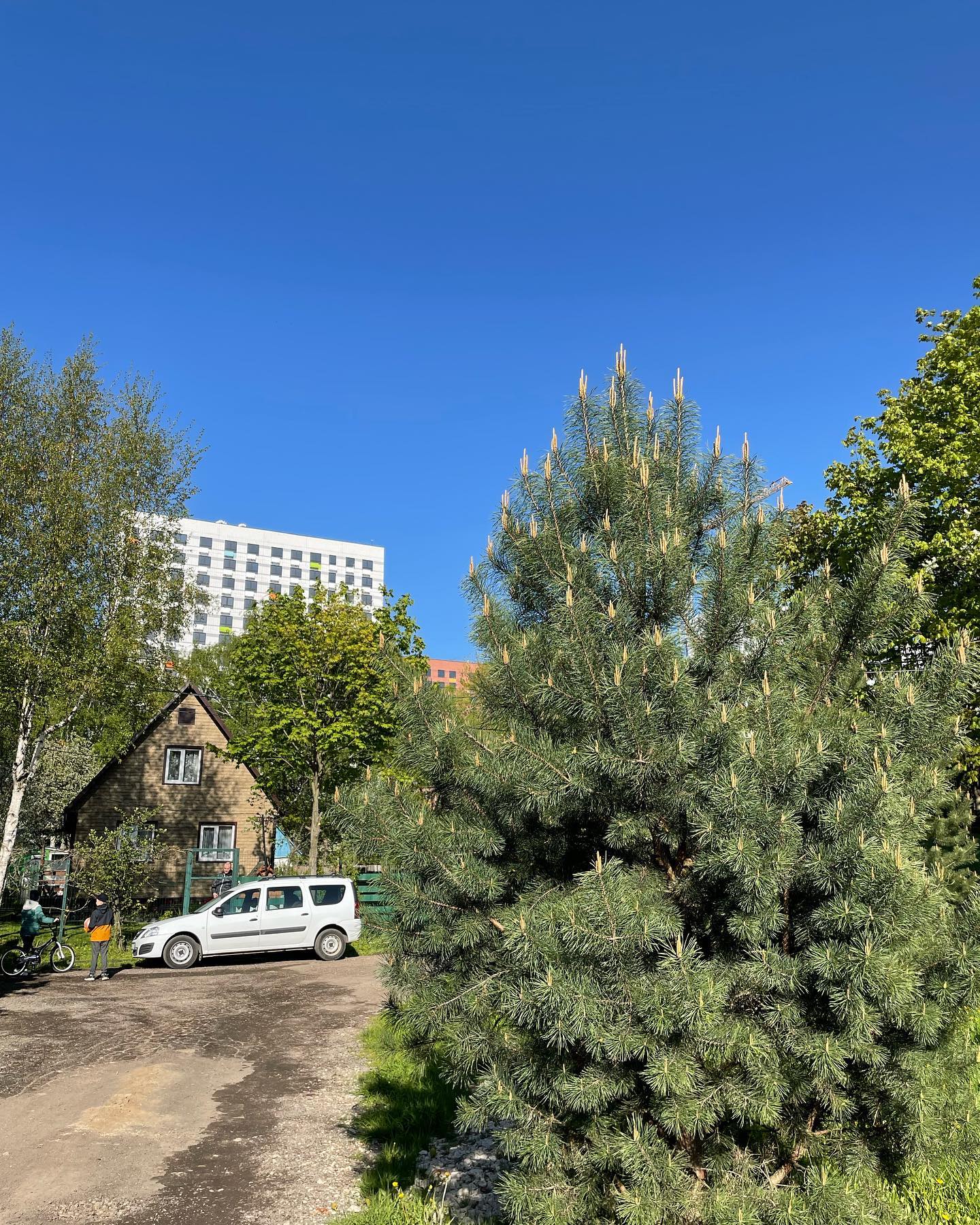 В воскресенье побывали в гостях в компании старинных друзей с позапрошлой работы, в удивительном месте в Южном Бутово. Старый СНТ со временем стал частью Москвы, а окружающие поля застроили современными кубами-человейниками, и среди них остался зелёный островок с садами, небольшими домиками и прудом