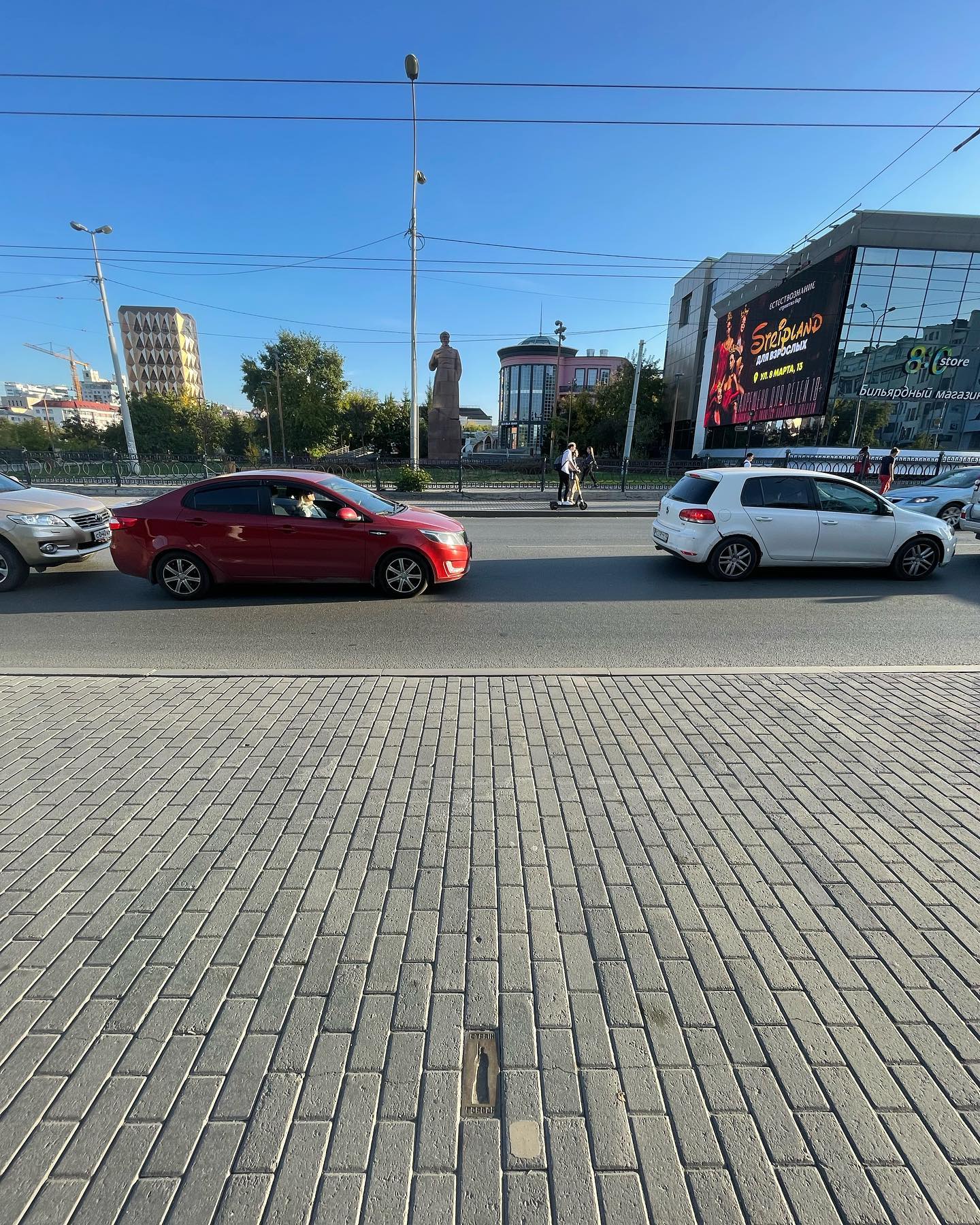 Екатеринбург называют столицей российского стрит-арта, здесь даже есть один из туристических маршрутов по городу (пунктирная розовая линия по мостовой), ведущий через все знаковые экспонаты. Мы не ходили специально, но объекты замечали походя неоднократно. В этой серии фоток вы можете увидеть Медведя Гришу (он выглядит надувным но сделан из полигонов-дощечек, прям как в тридэмакс конца 90х). На ещё одном фото — работа Страж Города, но её ещё нужно суметь рассмотреть.