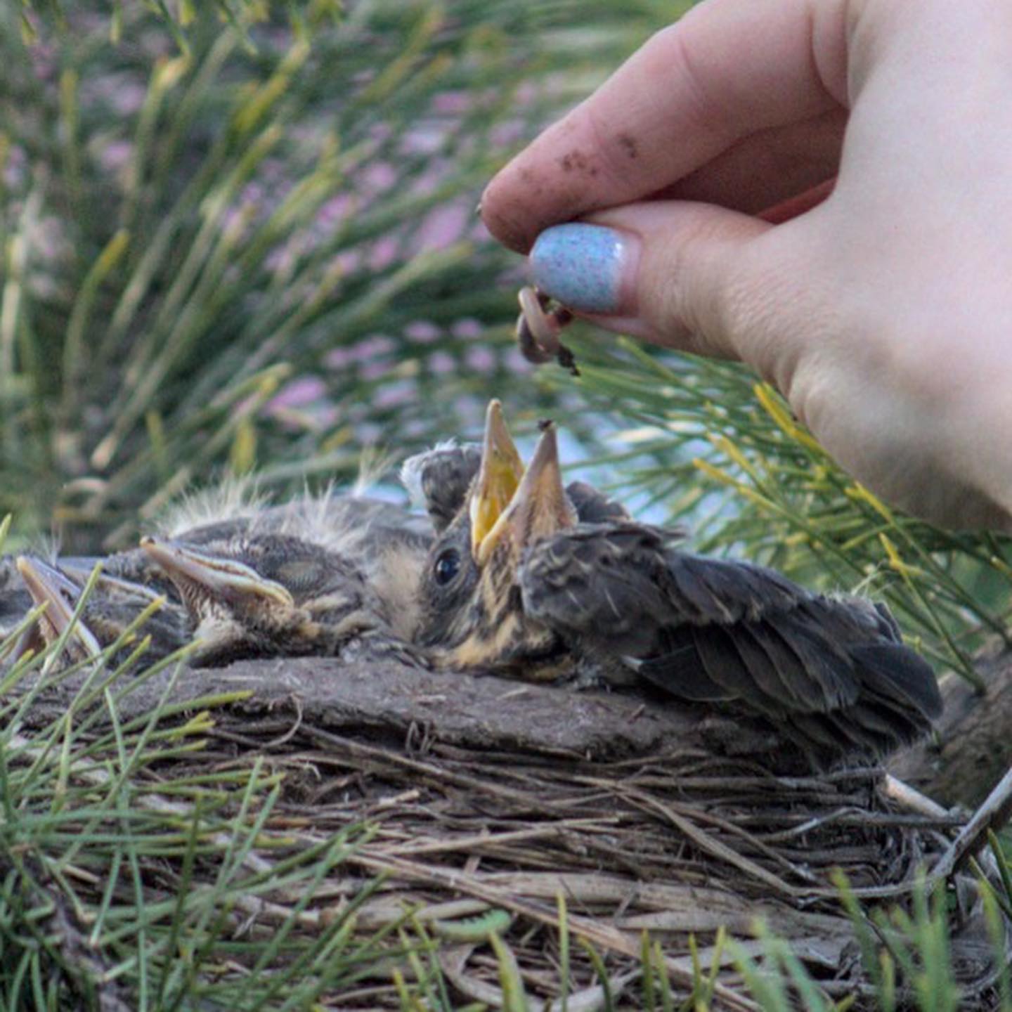 Натали пыталась подобраться к гнезду с телефоном — и была молниеносно атакована биологическими бомбами сразу от папаши и мамаши. Но это её не остановило — сначала для птиц были накопаны и выложены на садовый столик свежие черви (подарок проигнорирован), а потом оные черви были скормлены малышам вручную