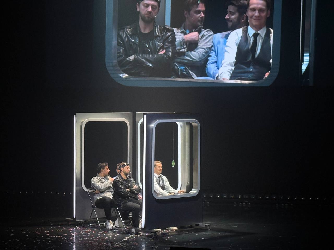 Так вот, сам спектакль мне понравился неимоверно. Классический подход «расскажем серьёзное, обмазав смешнявками», дополненный офигенной сценографией и постановочными приёмами. Начало второго отделения, решенное в видео-лайвлупинг технике сразило наповал, но и других моментов (особенно игр с камерой, транслирующей происходящее на сцене в другом ракурсе) было очень много. Шикарно работает расширение пространства минималистичных декораций через свет и видеоэффекты. Полноэкранный Марио про жизнь — ультравосторг! Актёрская игра, танцы, гэги и синхронные приколюхи, песни и живые инструменты, постоянные повороты сюжета и слом четвёртой стены, да то же филигранно-снайперское выкатывание покрышек под финал — представляю, сколько труда вложено в такой результат.