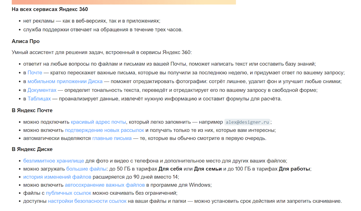 Давно и успешно обладаю элитным платным тарифом Яндекс 360 для состоятельных мужчин — и вот что об условиях тарифа говорится на промо-странице, которую показывают при его покупке: